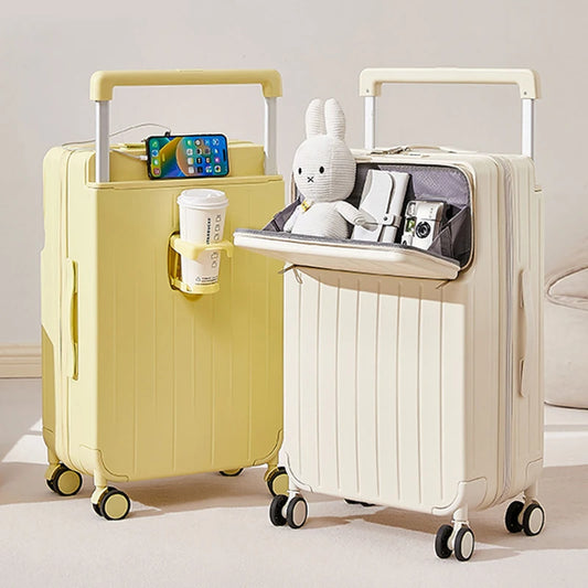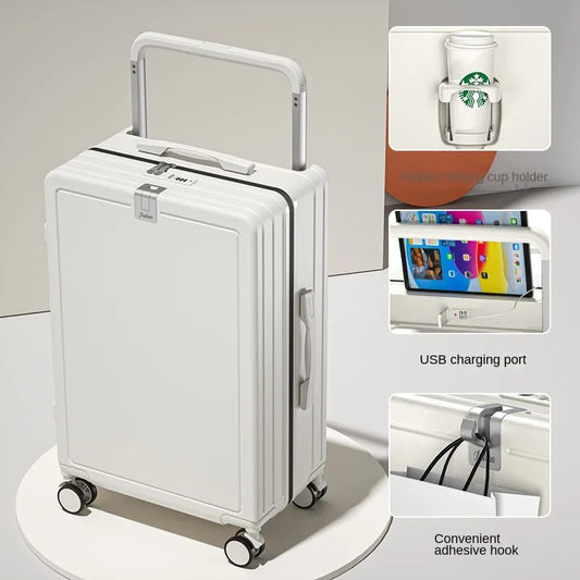 Multifunctional Draw-Bar Suitcase Zipper Wide Handle Trolley Luggage with Cup Holder USB Port 20 Inch Carry On Travel Suitcases