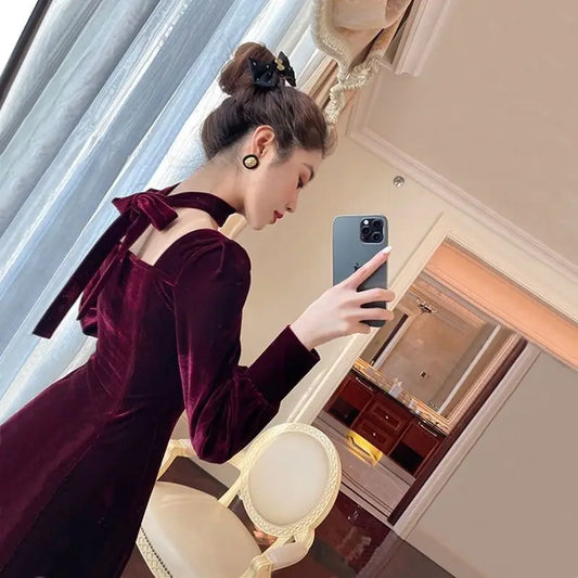 Sexy Dress Women French Retro Vintage Square Collar Waist Office Lady Wine Red Golden Velvet Autumn and Winter Female Clothing