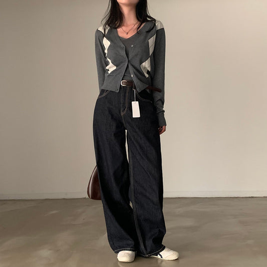 Retro Diamond V-neck Long-sleeve Knitwear Vest Suit