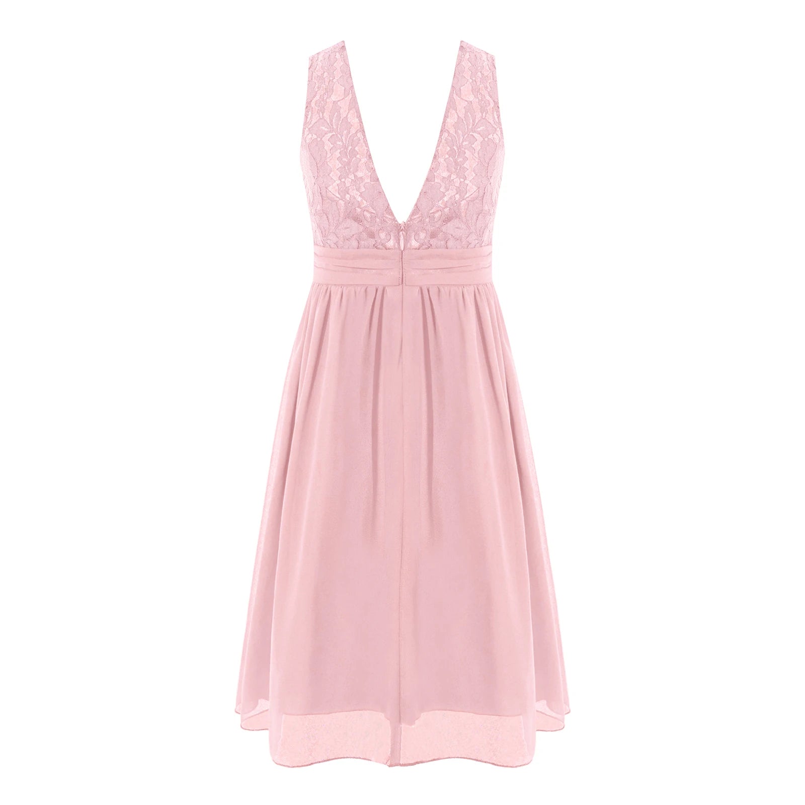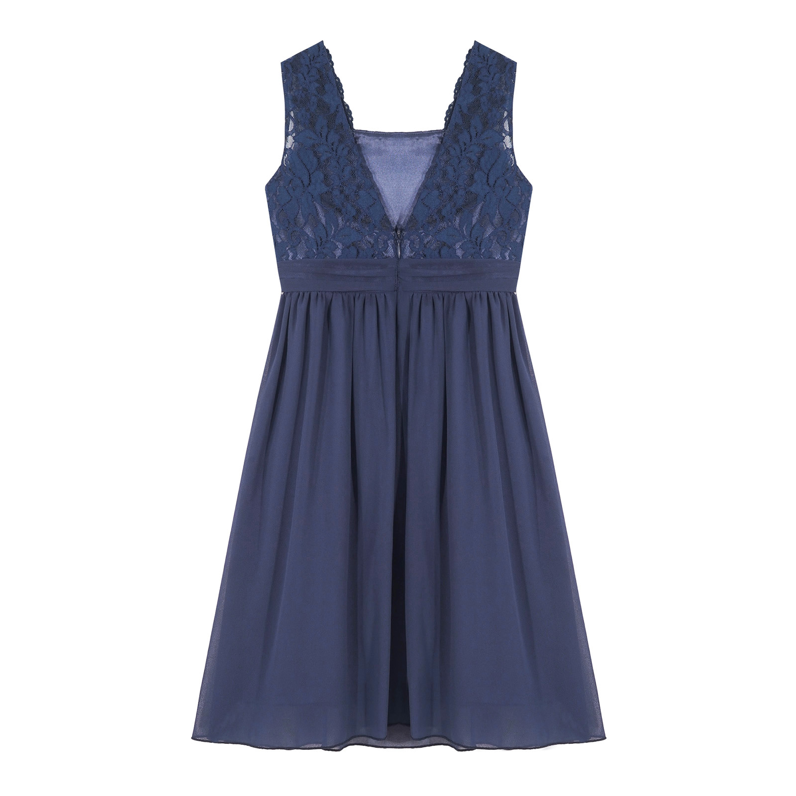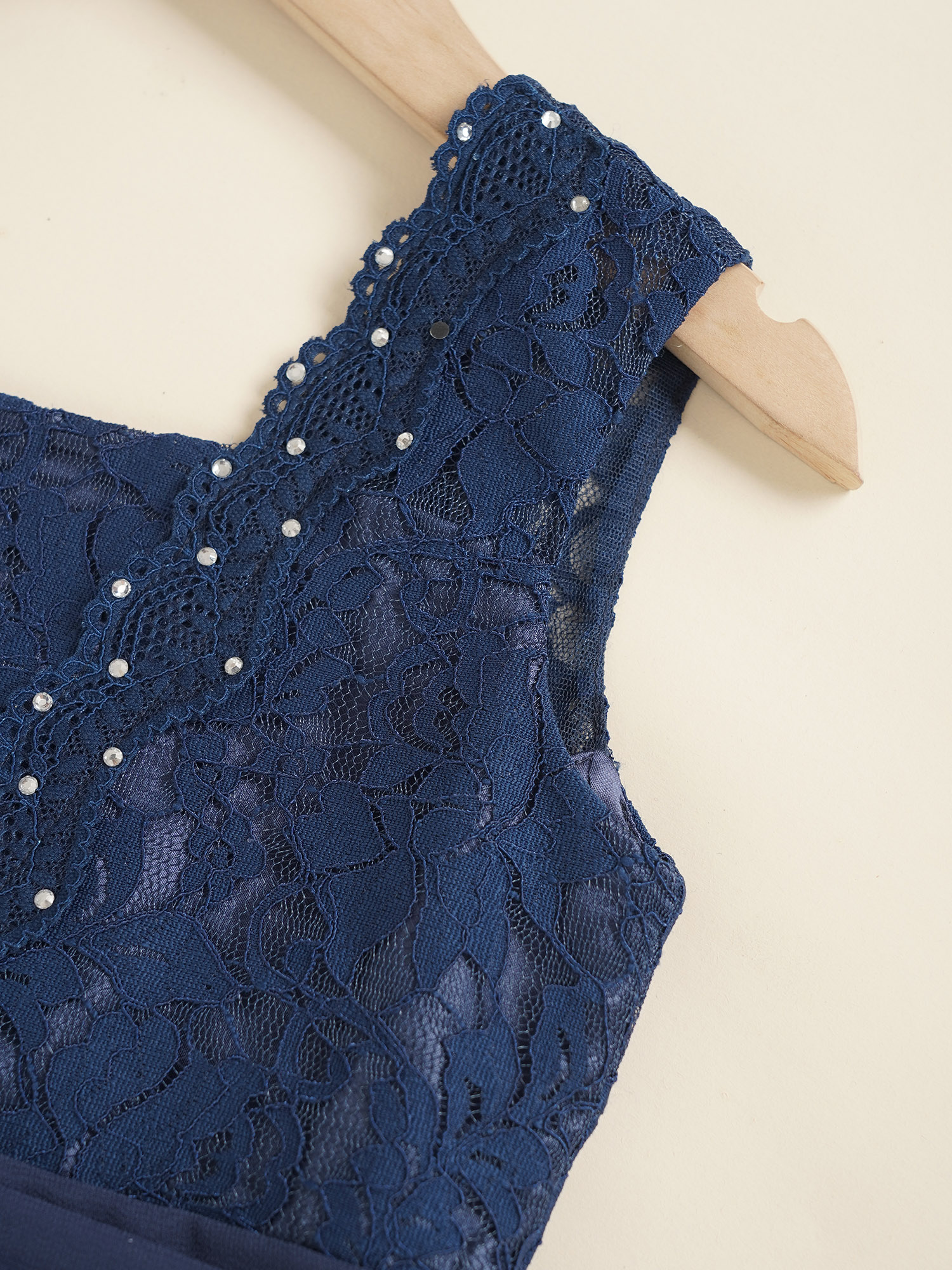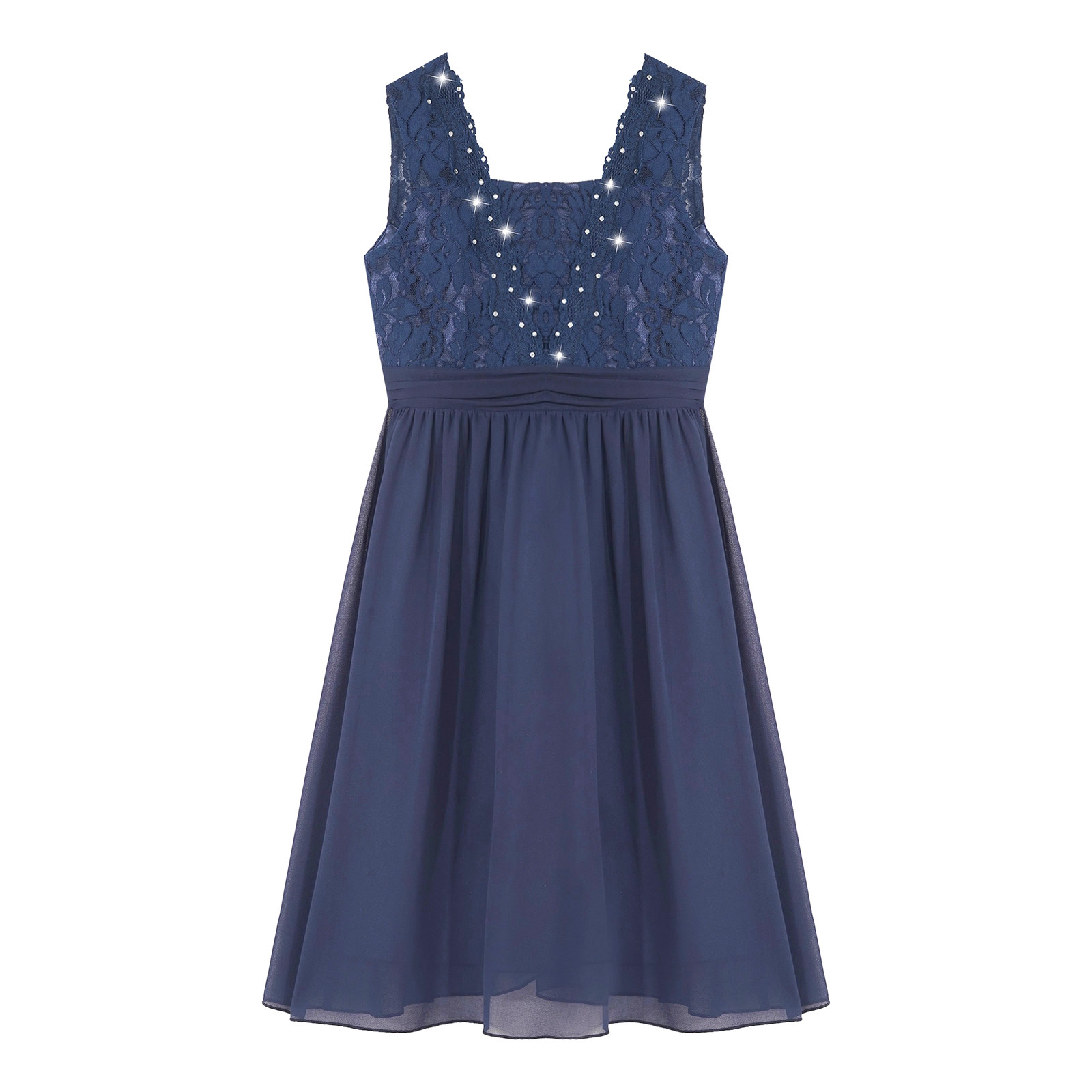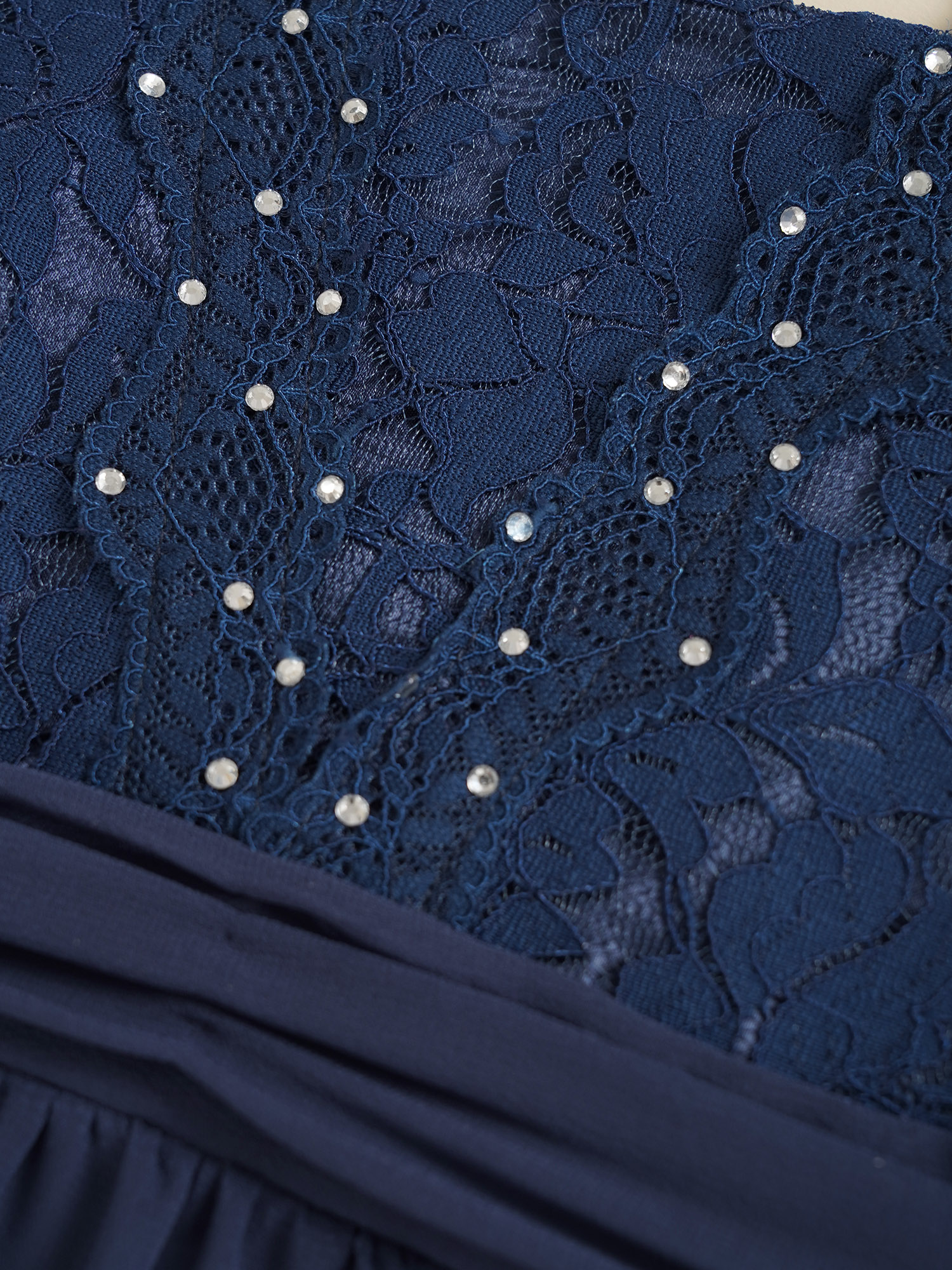 Sleeveless, square neck, v-shaped back, floral lace bodice with shiny decoration, flattering pleated waistline.
