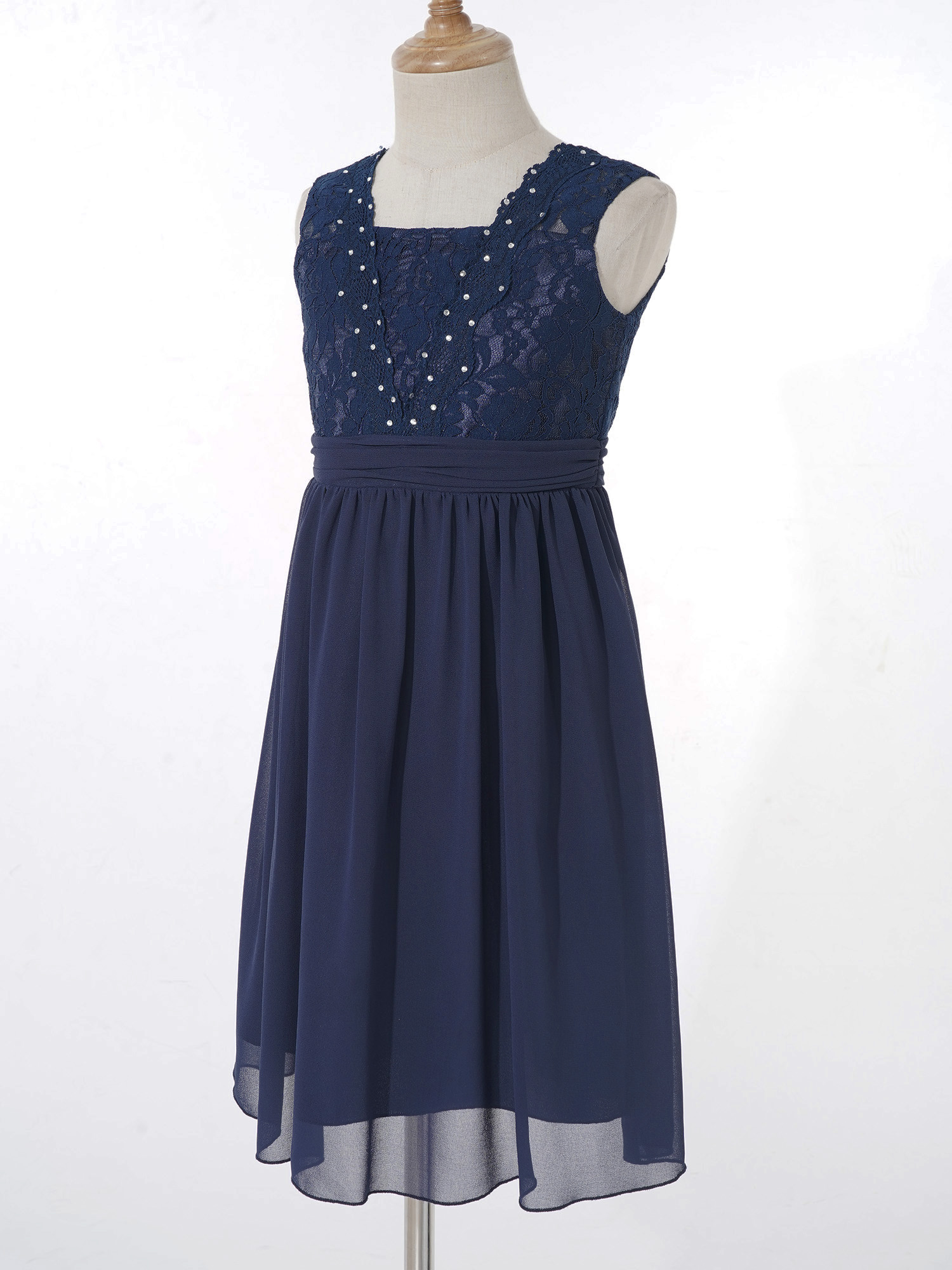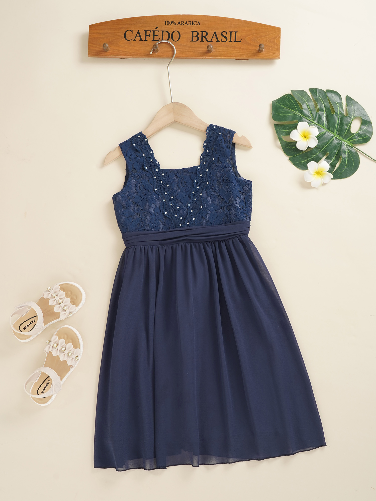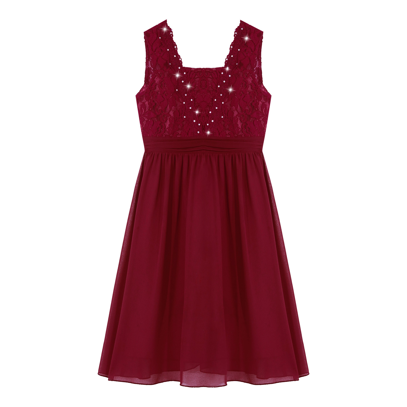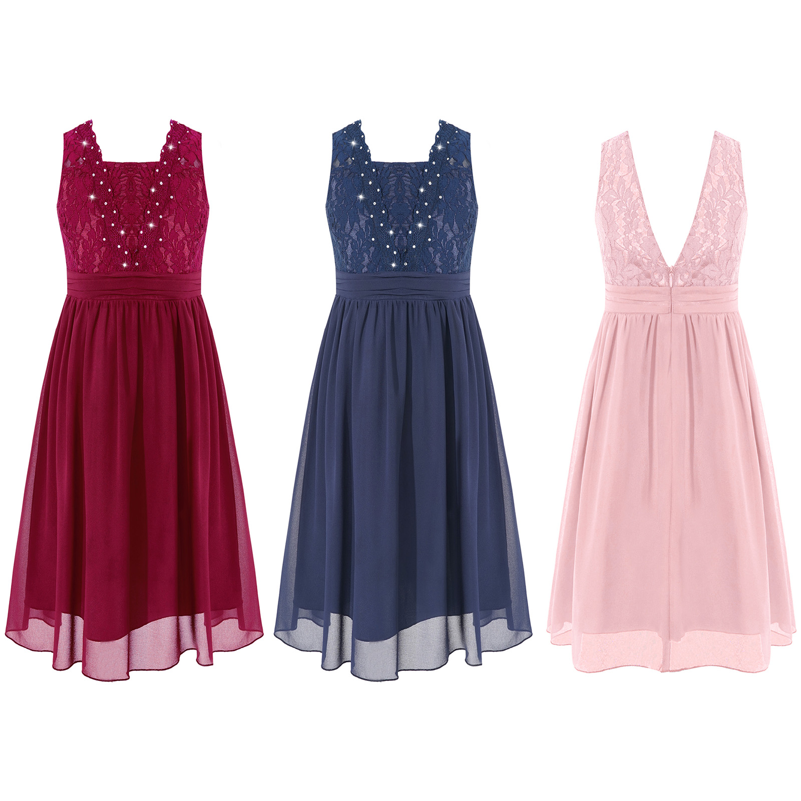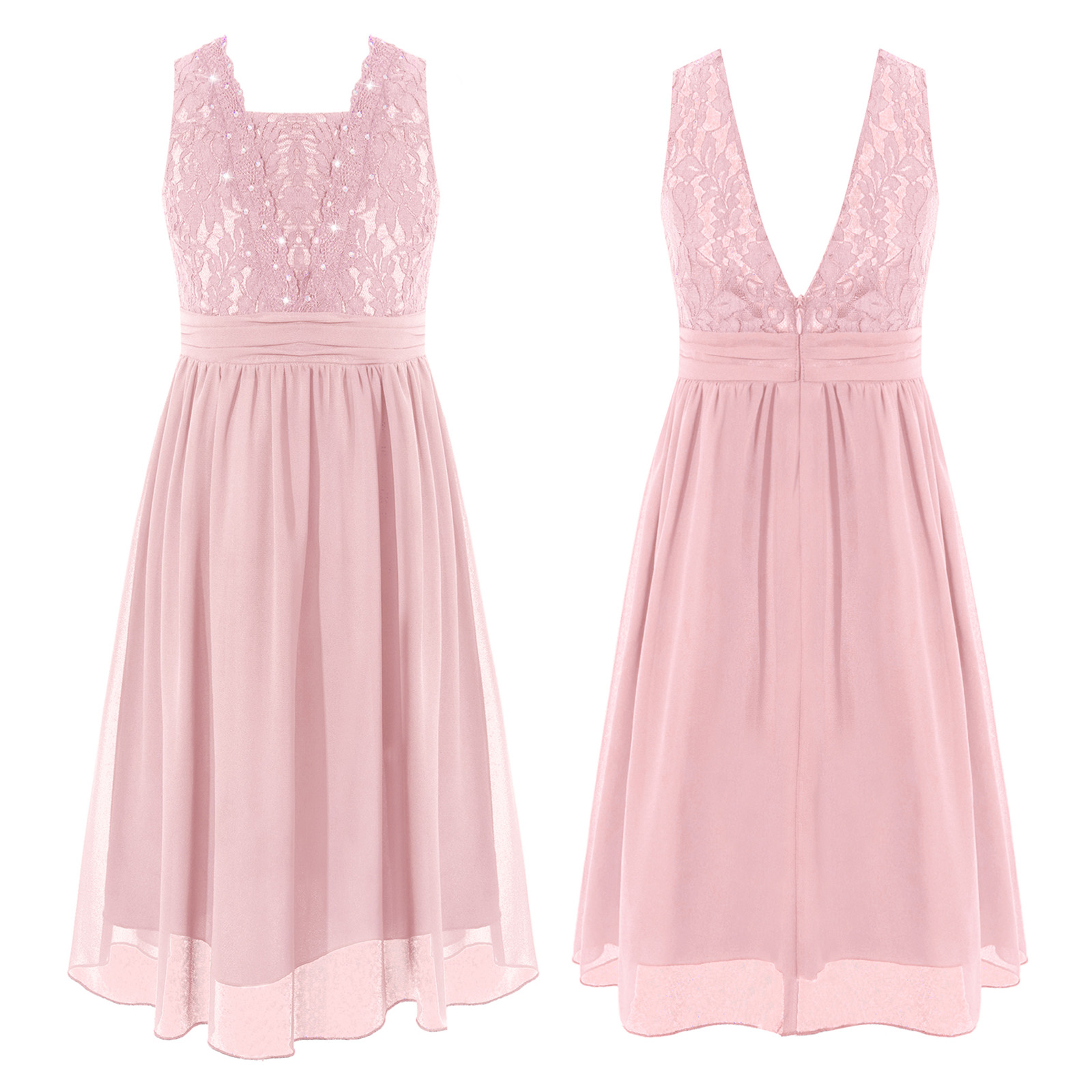Girls Sheer Floral Lace Chiffon Party Dress Bridesmaid Clothing Sleeveless Backless Pleated Princess Dress for Wedding Birthday