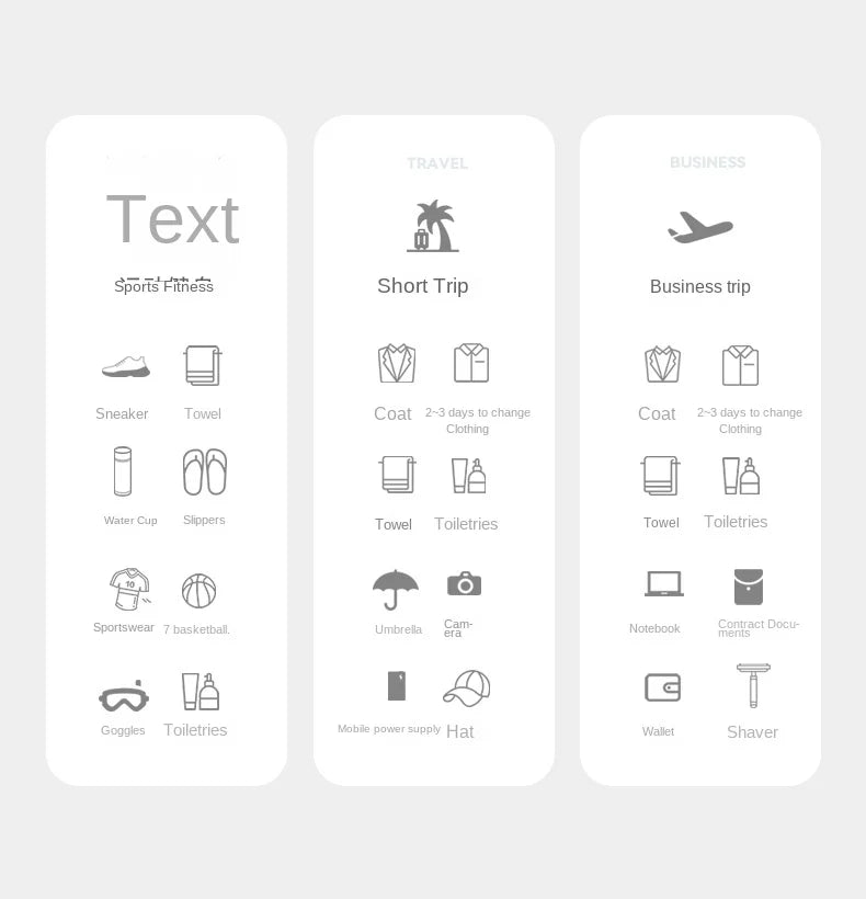 External: 2 front zipper pockets, 1 front magnetic buckle insertion pocket, 1 shoe compartment, 1 rear wet dry separation layer.