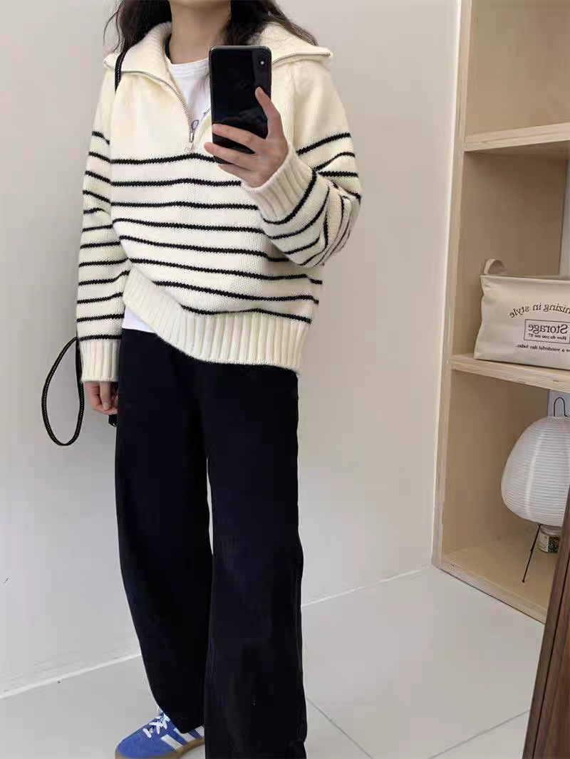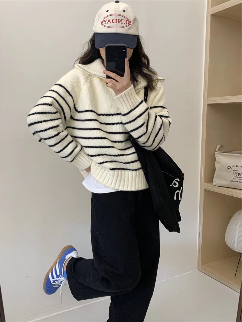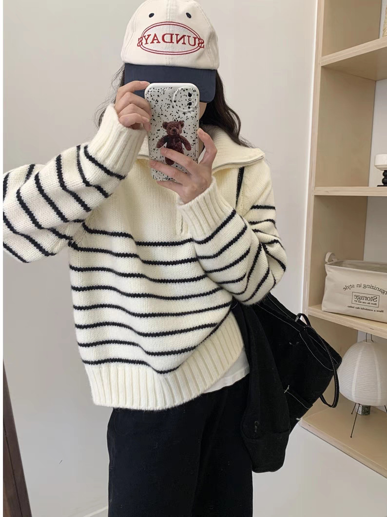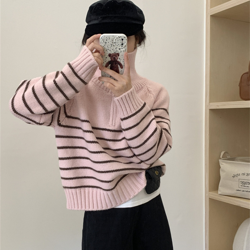 Half-zip Stand Collar Women's Korean-style Niche Striped Loose Sweater