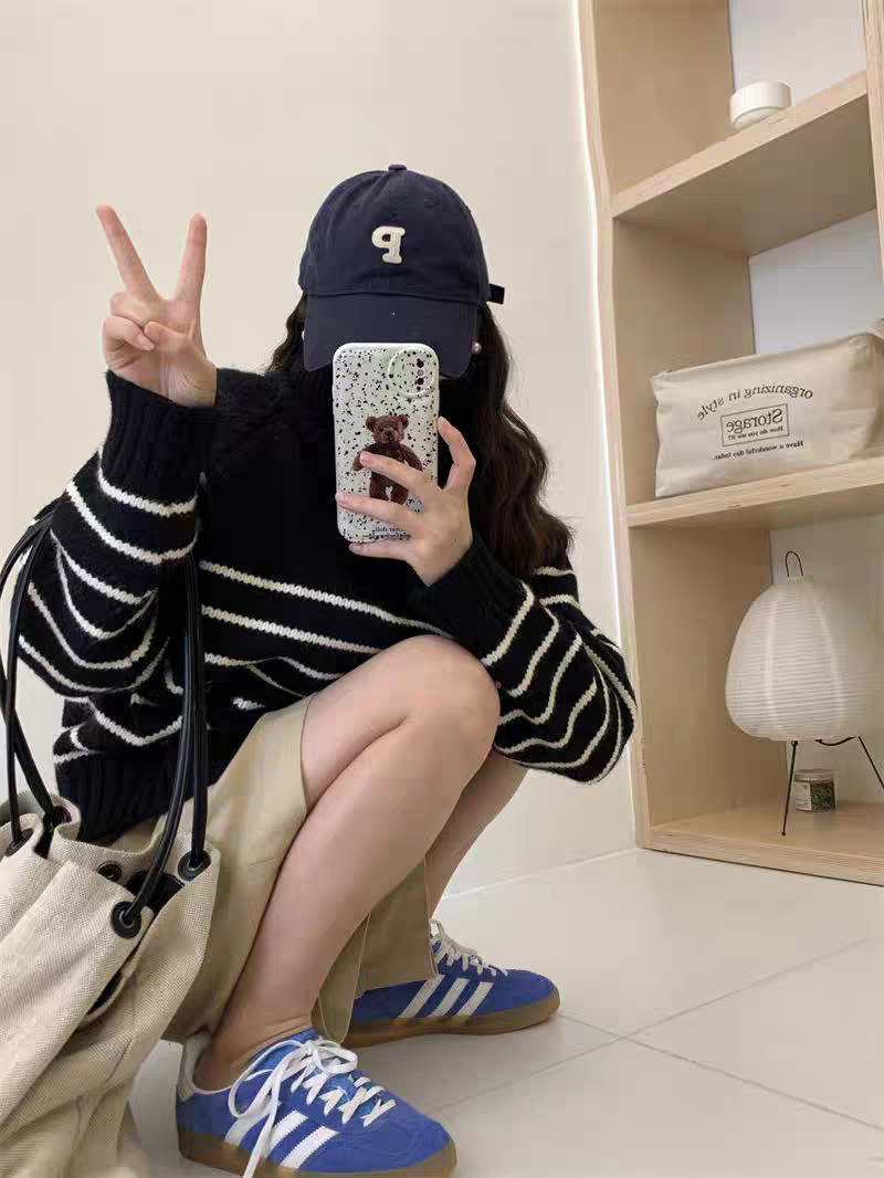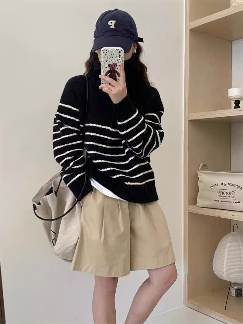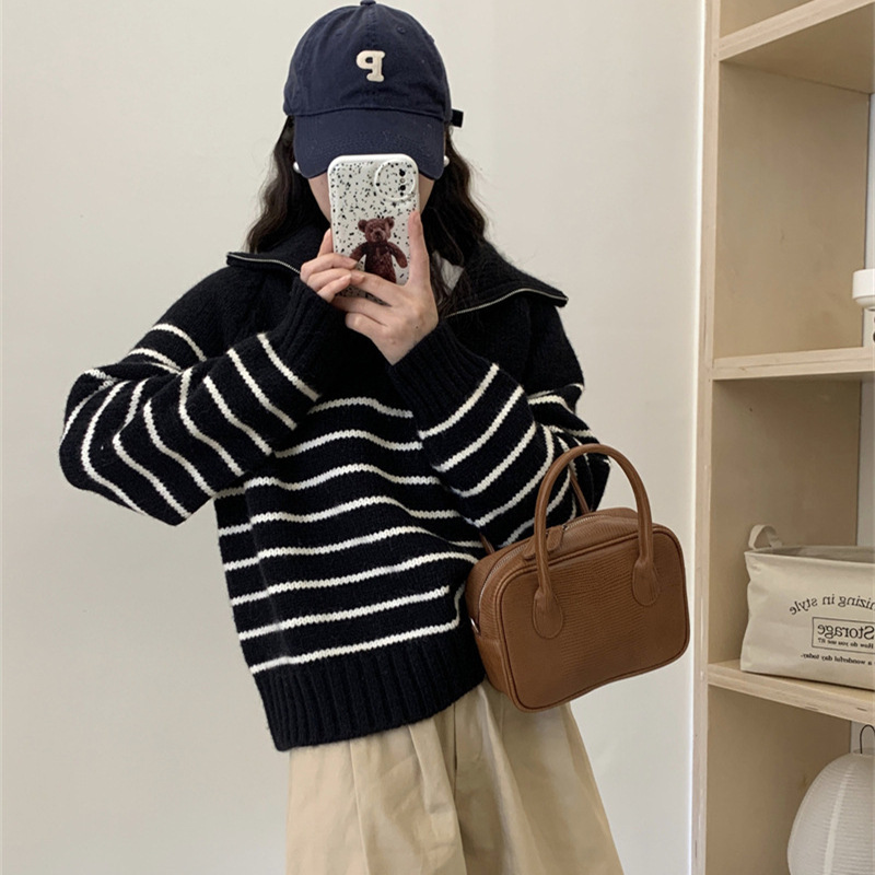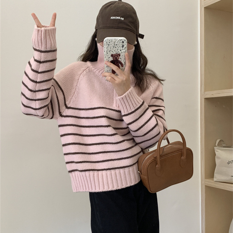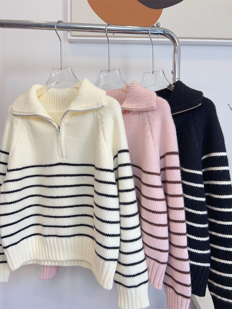 Half-zip Stand Collar Women's Korean-style Niche Striped Loose Sweater