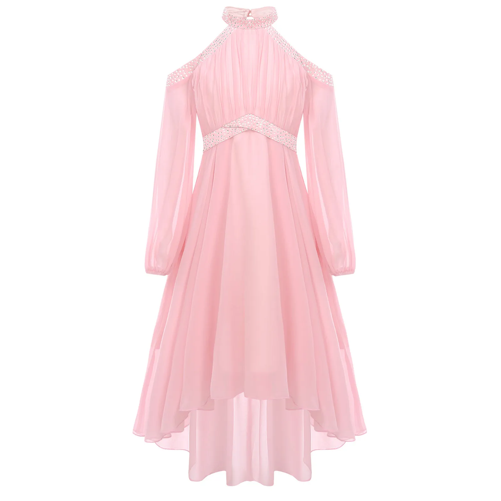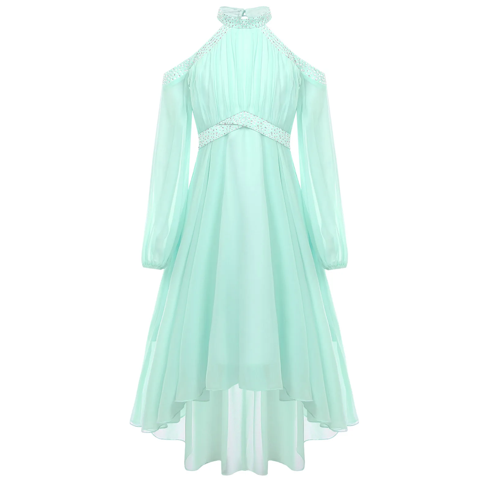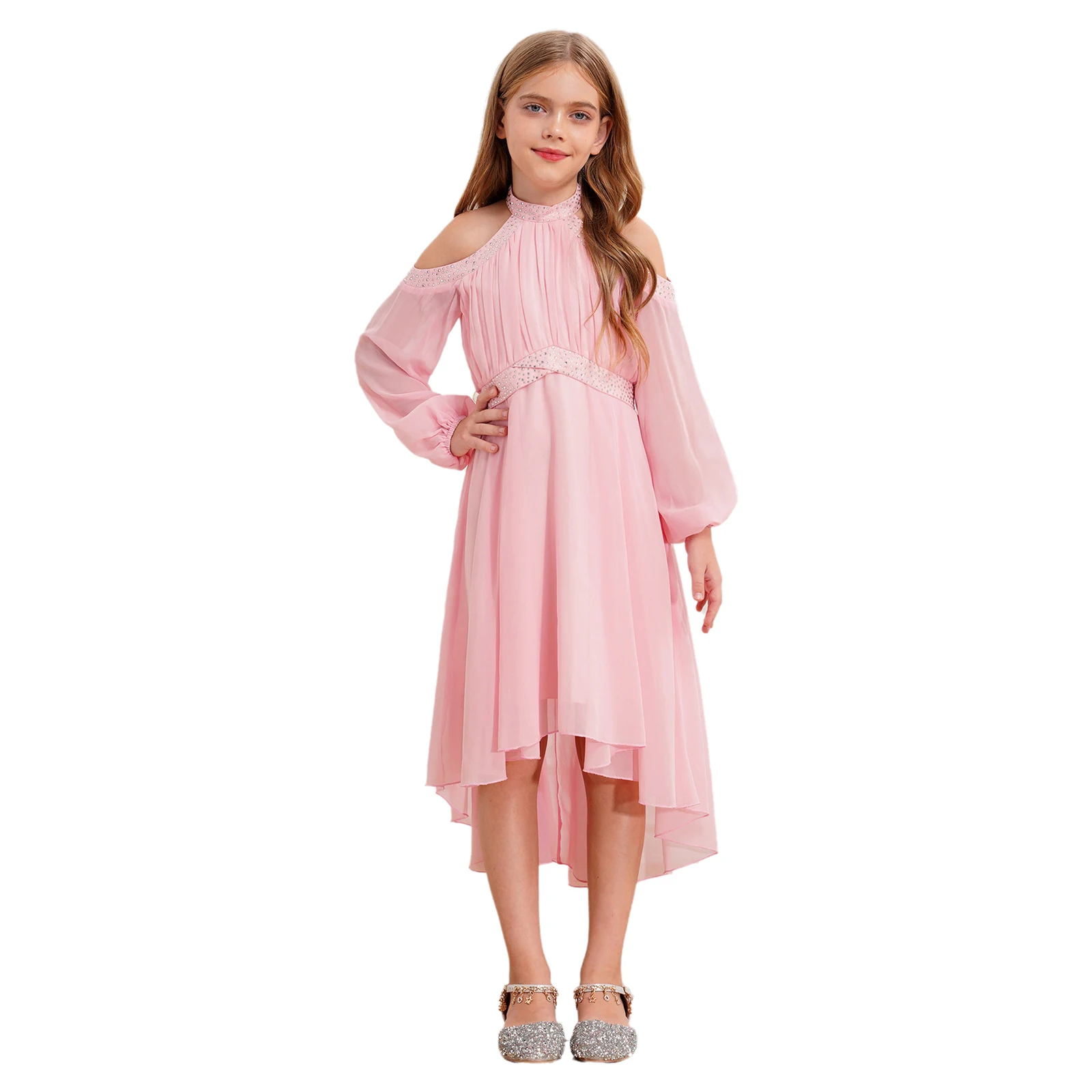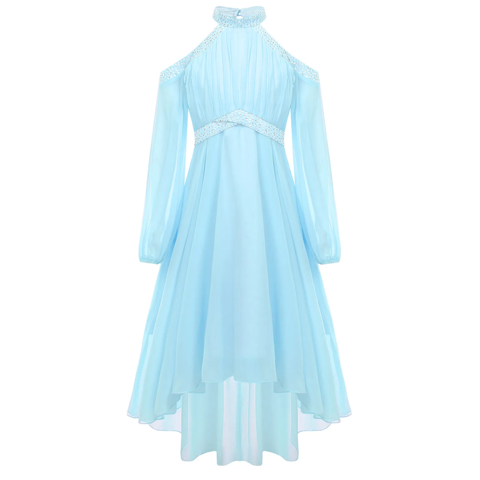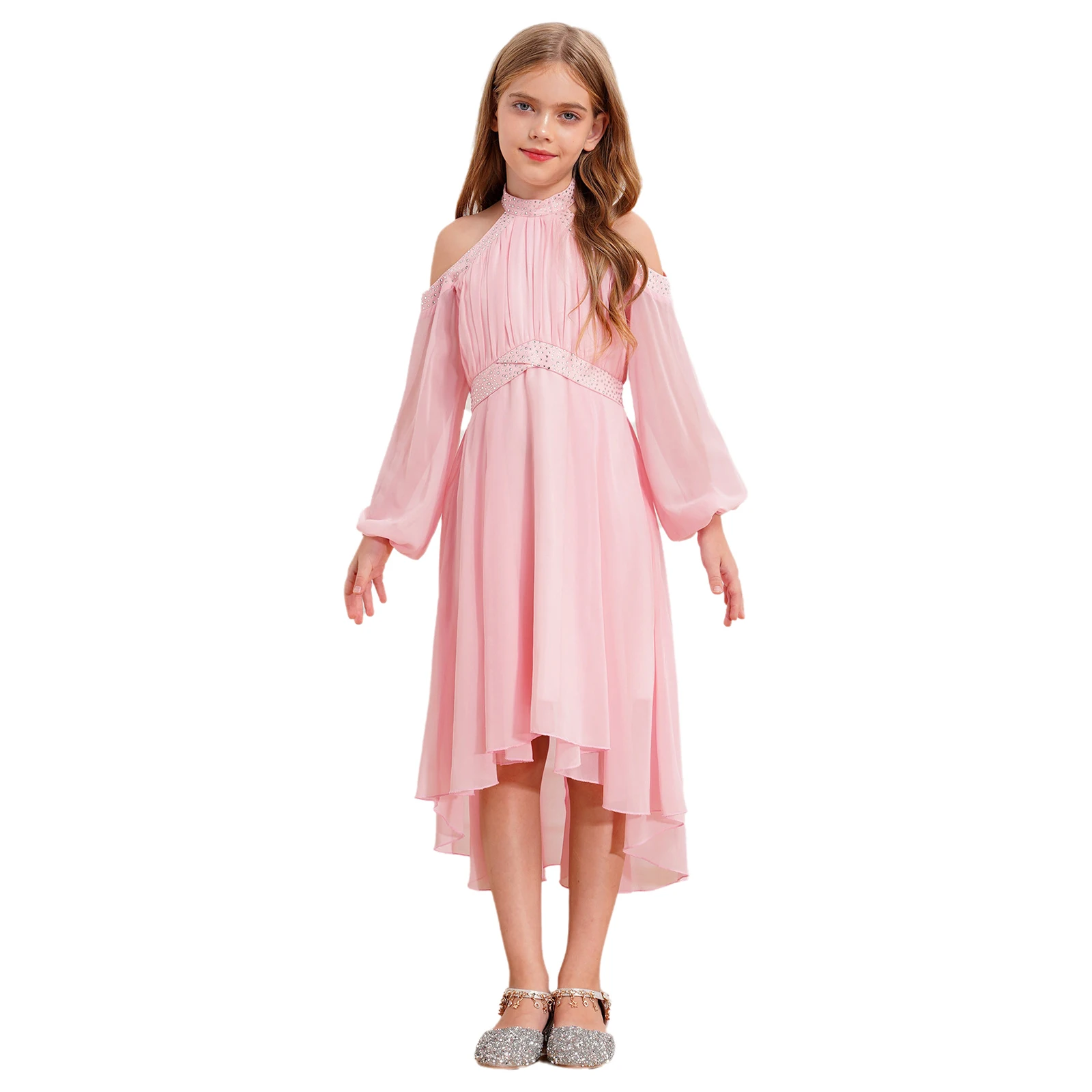 Kids Girls Elegant Party Dress Halter Off-shoulder High Waist Ruffled Chiffon Dresses Wedding Birthday Pageant Evening Prom Gown