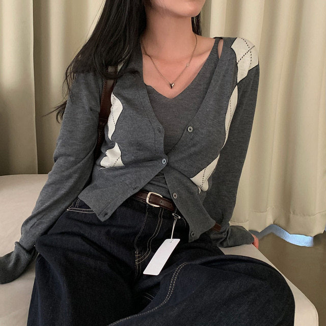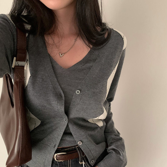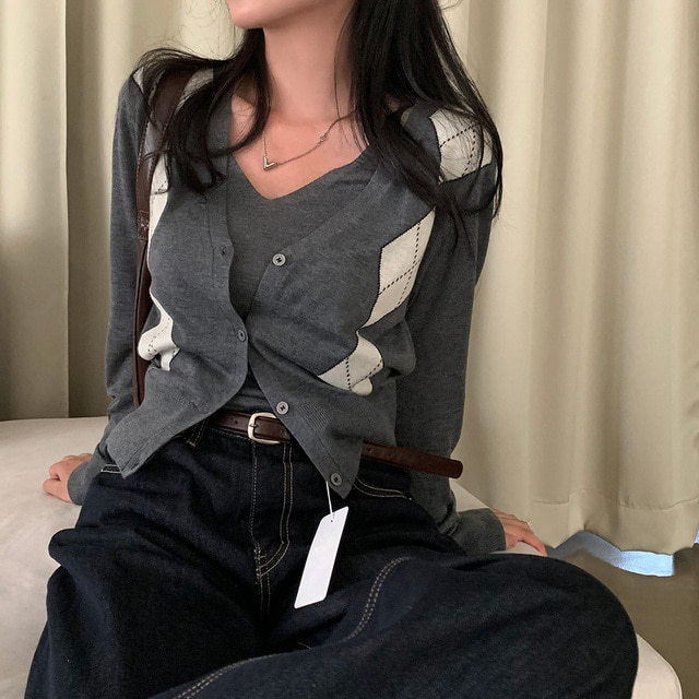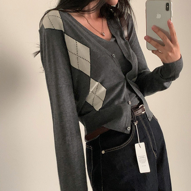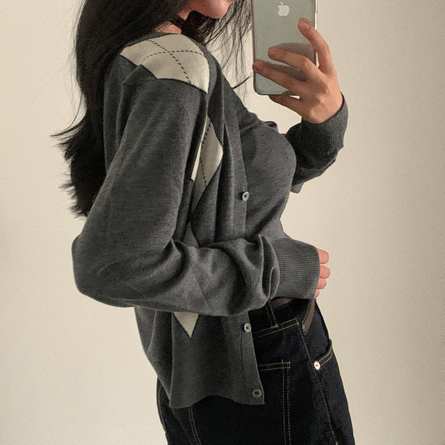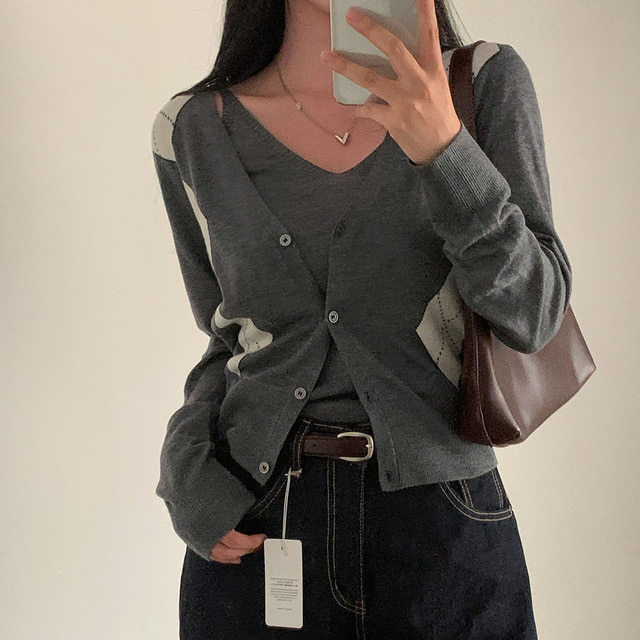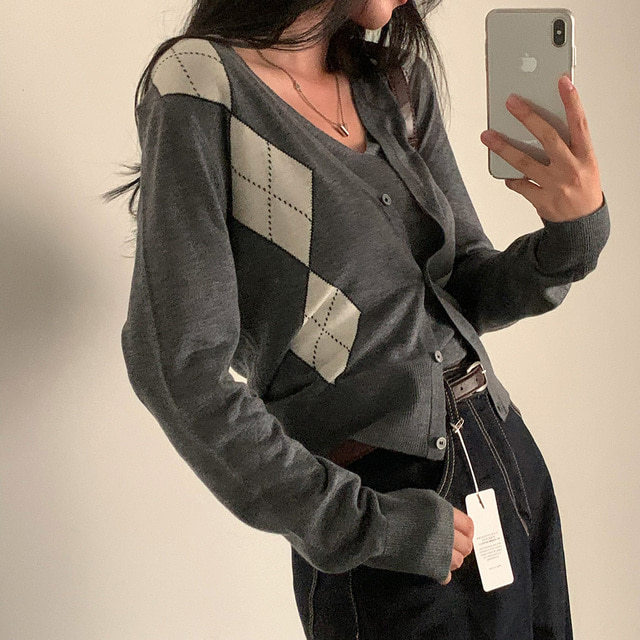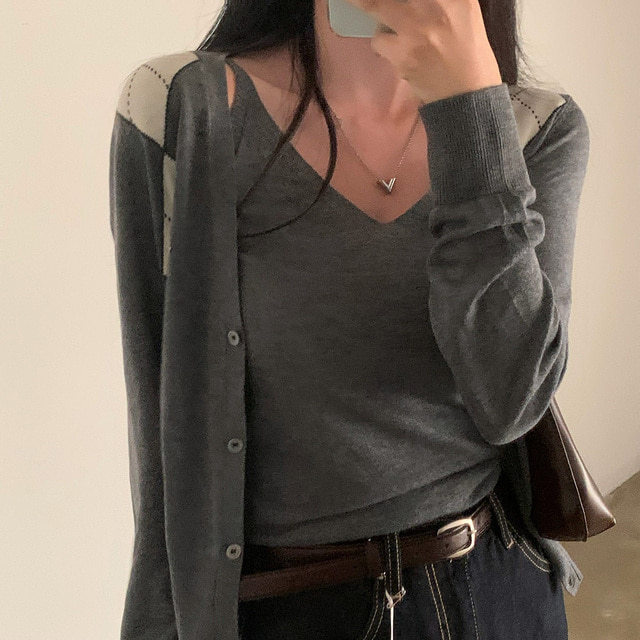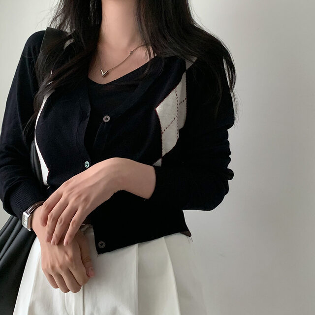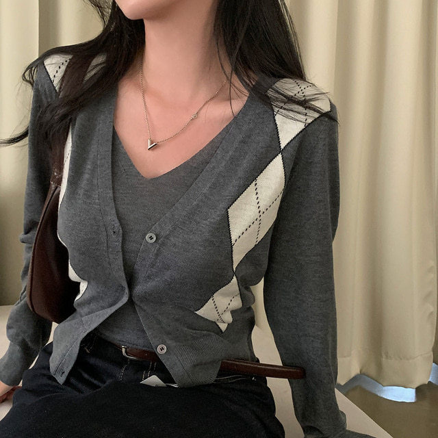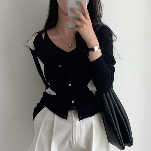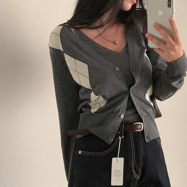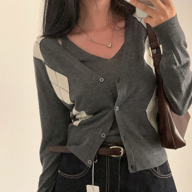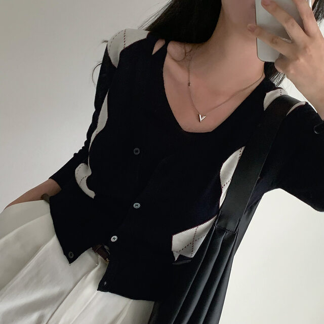 Retro Diamond V-neck Long-sleeve Knitwear Vest Suit
