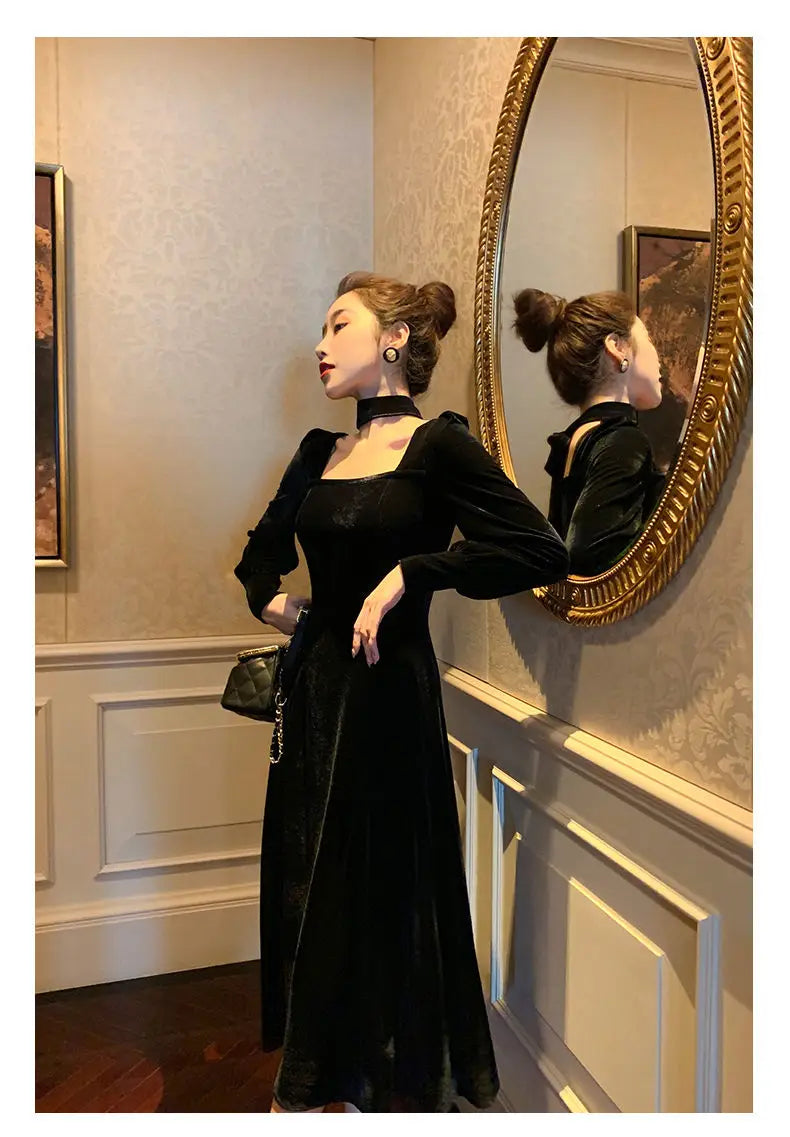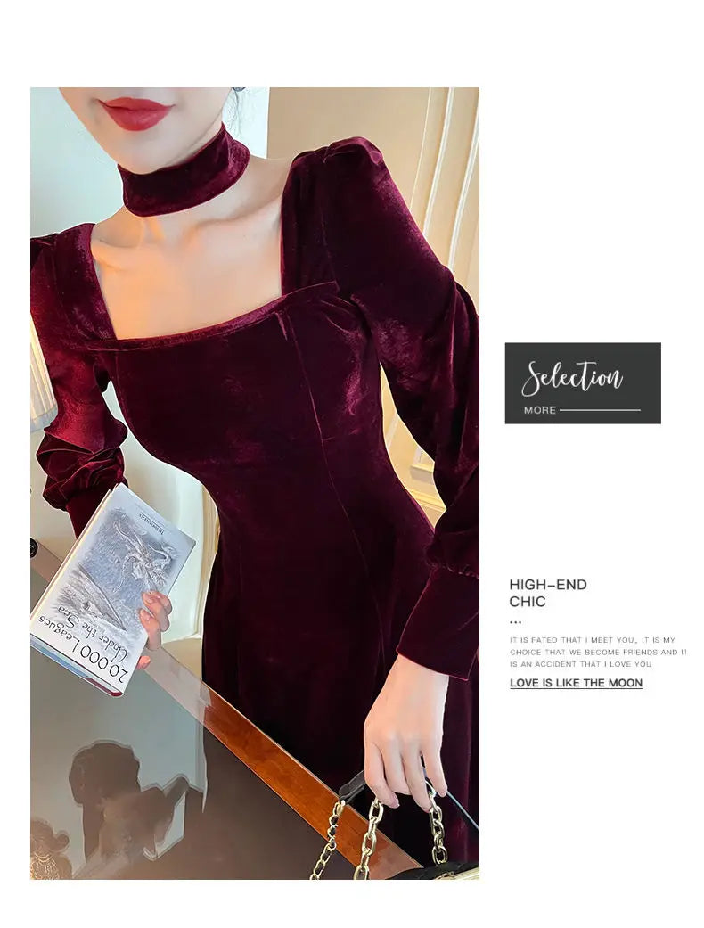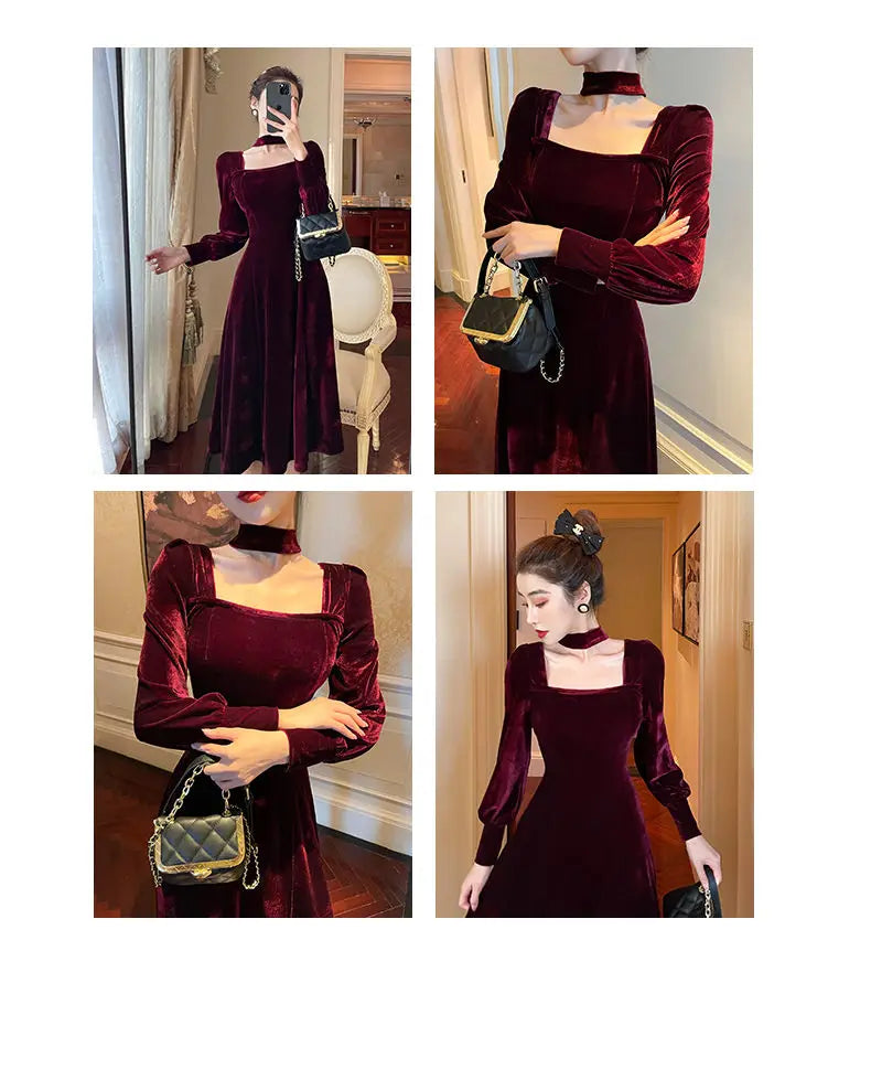 Sexy Dress Women French Retro Vintage Square Collar Waist Office Lady Wine Red Golden Velvet Autumn and Winter Female Clothing