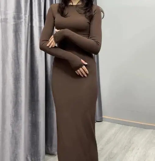 Womens Dresses 2025 Spring Autumn New Fashion Sexy Skinny Hip Hugging Comfortable Solid Color Casual Round Neck Long Dress