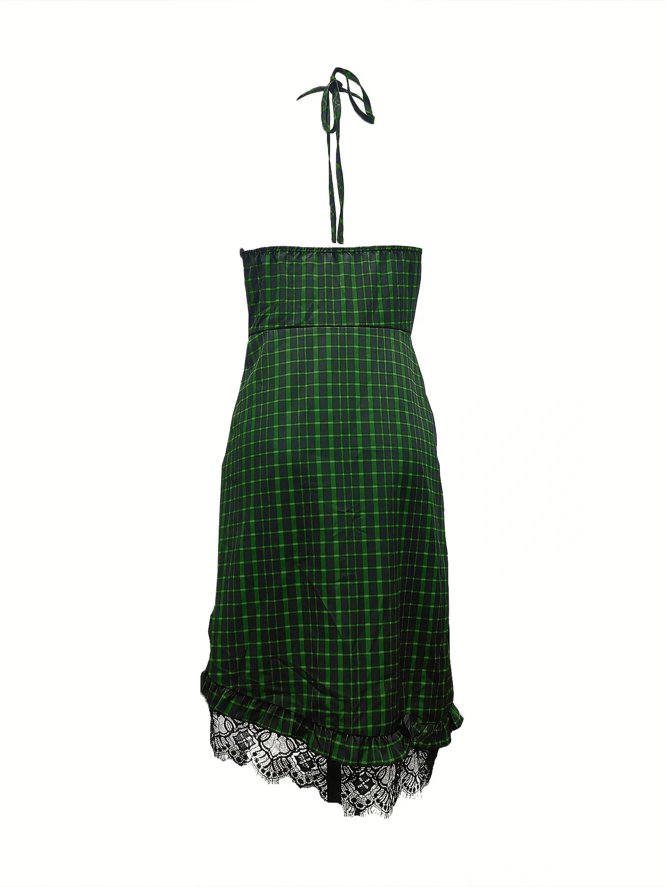 Women's Plaid Cowboy Dress Deep V-Neck Asymmetric Hem with Lace Belted Western Style Ideal for Bohemian Outings