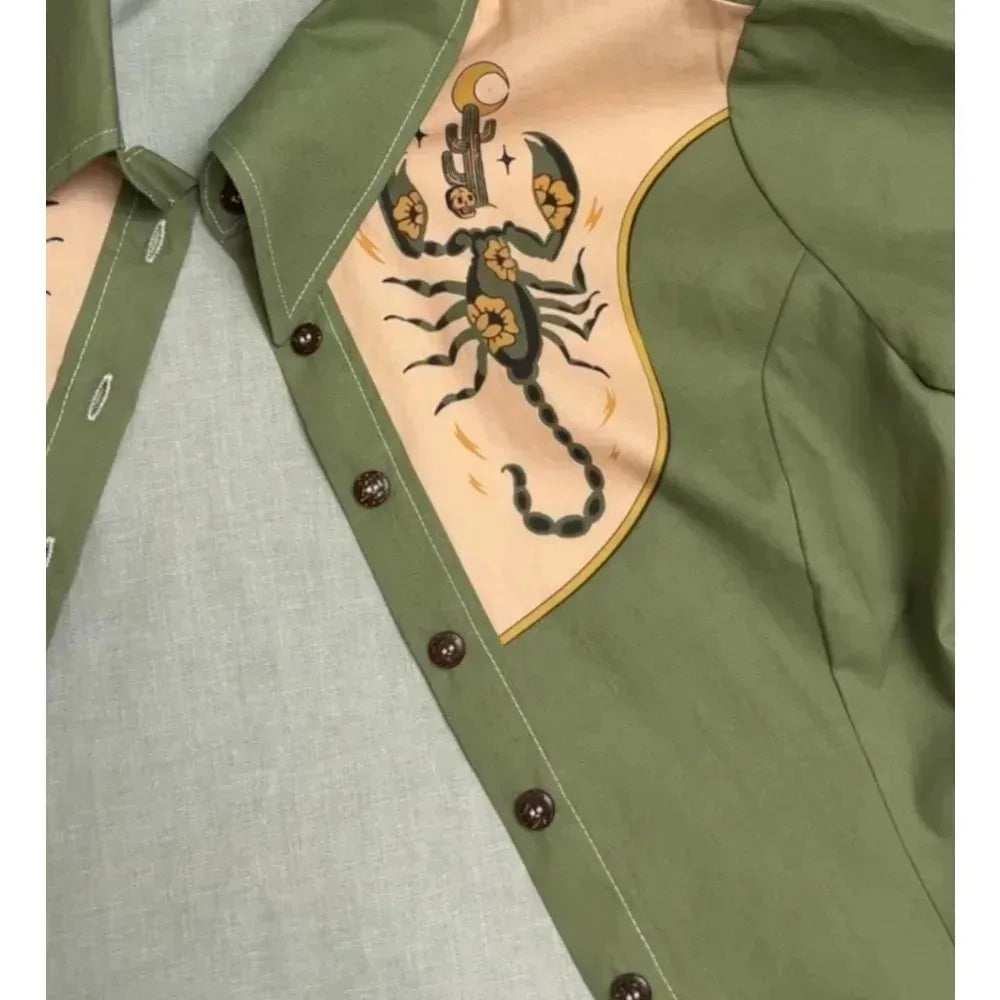 Women's Western Shirt Dress with Music Notes and Dolphin Print Cowboy Collar Button Up Pure Cotton Midi Dress Casual Boho Style